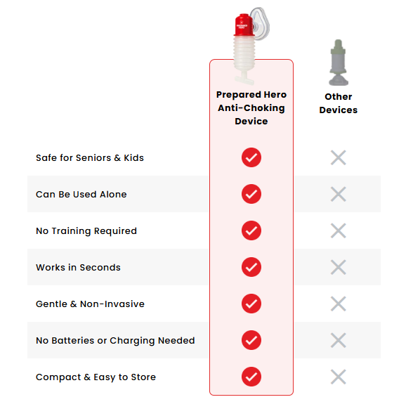 Prepared Hero is a revolutionary choking rescue device that works instantly to clear airway blockages. Keep your family safe during meals, holiday gatherings, and everyday moments with this must-have emergency device.
